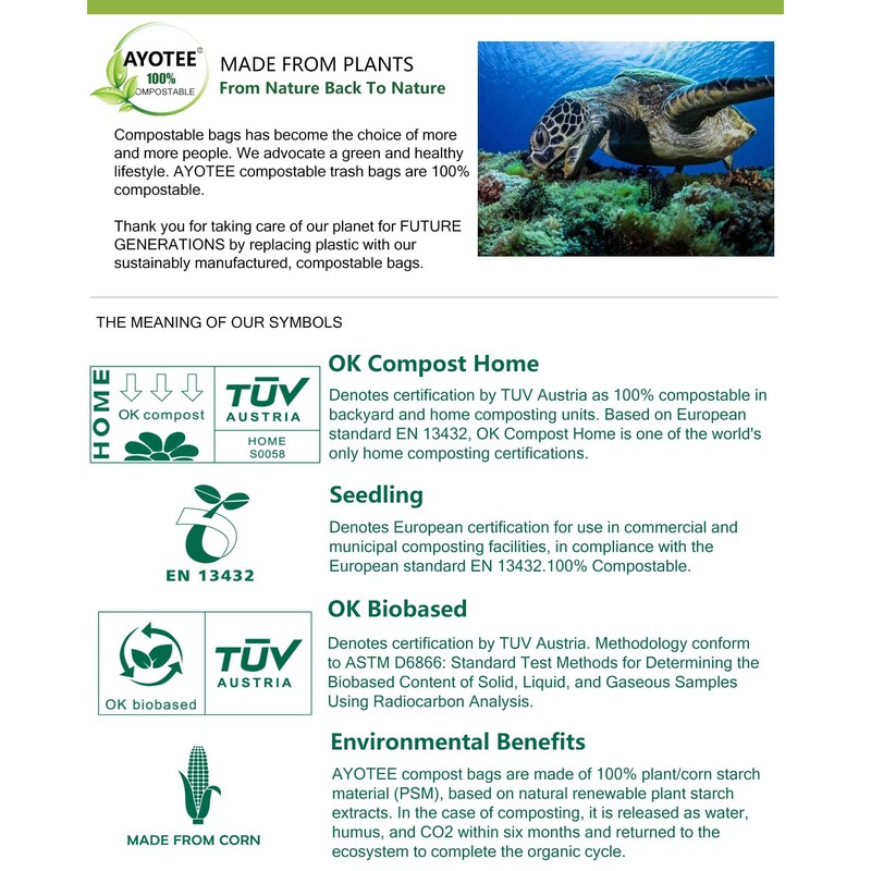 - ✔【小さな堆肥可能ゴミ袋の証明書】AYOTEE 堆肥可能ゴミ袋は、米国ASTM D6400規格の認定を受けています。 これらの堆肥ゴミ袋は、VinçotteとTüvオーストリアのヨーロッパ基準EN 13432に基づいてOK Compost Home認定されており、家庭での堆肥化施設や裏庭での環境へのダメージを与えることなく100%の堆肥化可能性を保証しています。 ロール状に発送 実用的なダンボールボックス付きで 小さなゴミ袋も簡単に取り出して収納できます。