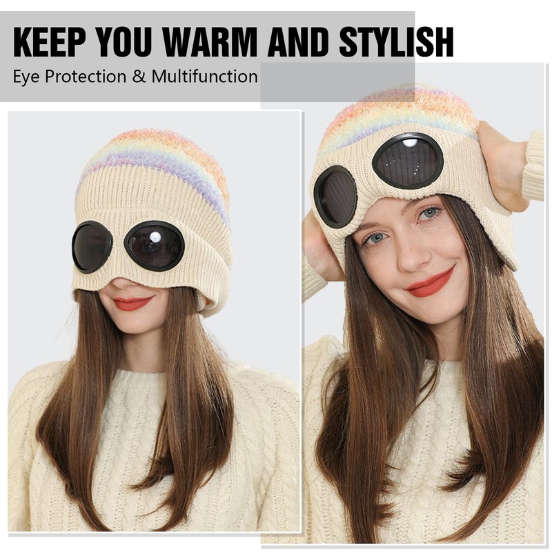 - 【Multipurpose & Stylish】This thermal beanie hat women embraces a simple yet stylish design, features earflaps and goggles to shield your head, ears, and eyes from sun and cold air. Whether paired with a coat, sweatshirt, or down jacket, it can complements a range of outfits.