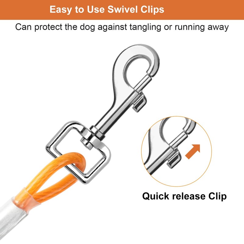 - Upgraded Locking Hook - The clips ends are equipped with a sliding barrel type lock, which prevents the latch from opening and the dog getting loose. The 360° rotating design keeps the cable stay tangle free no matter how many times the dog turns around. Works great to let your dog have plenty of room to run while keeping it safe.
