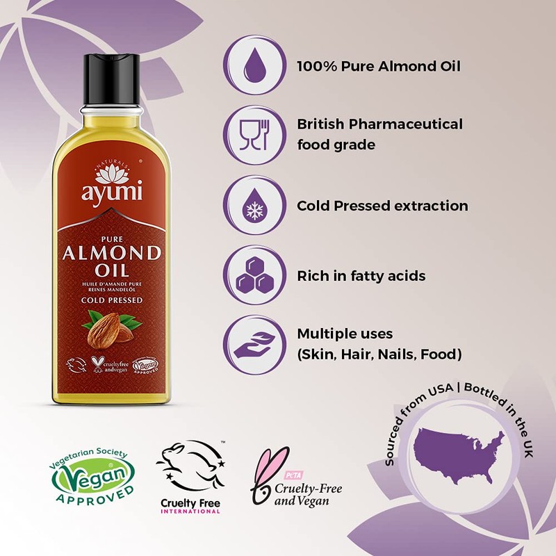 Ayumi Pure Almond Oil, Rich in Fatty Acids to Keep Skin Protected From Dryness & Wrinkles, Alleviates Dry Hair & Scalp Conditions - 3 x 150ml