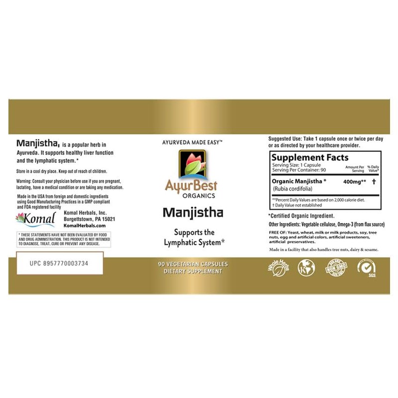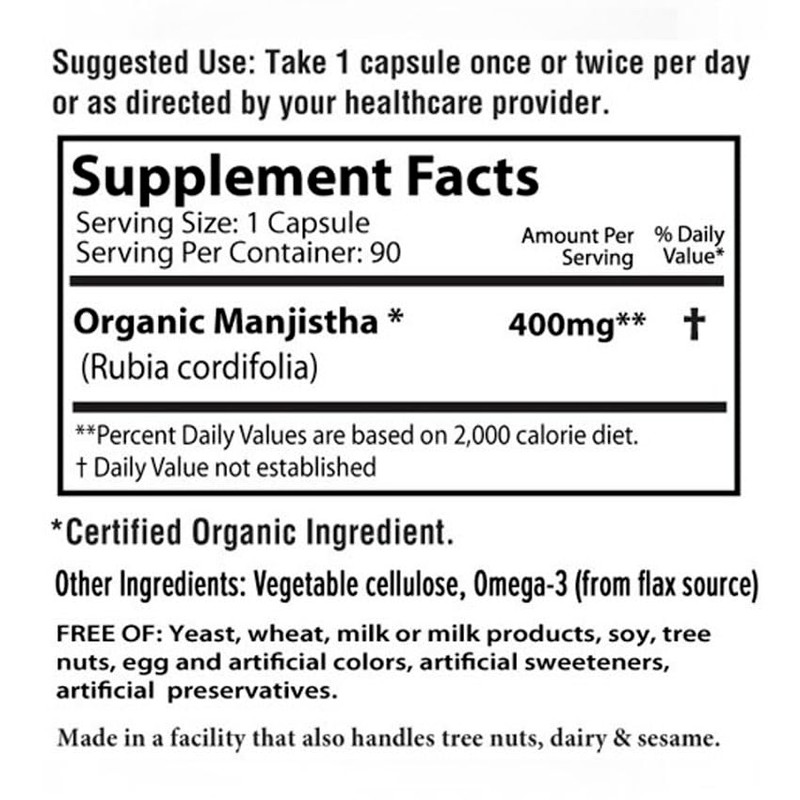 AyurBest Manjistha Herbal Supplements 400mg Capsules, USDA Organic, Kosher - 90 Count