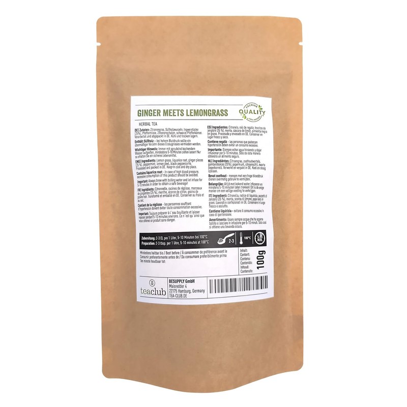 - ✅ KRÄUTERTEE mit ausgewählten und aufeinander abgestimmten Zutaten: Zitronengras, Süßholzwurzeln, Ingwerstücke (25%), Pfefferminze, Zitronenschalen, schwarze Pfefferkörner.