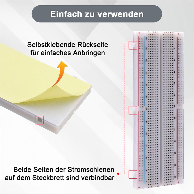 - EXPANDABLE CONFIGURATION Side ports allow quick connections between different breadboard sizes, self-adhesive backing for convenient mounting.