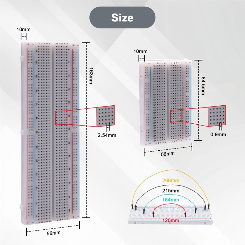 400 point breadboard: 82x55x9mm with 300 circuit terminals and 4 power rails.