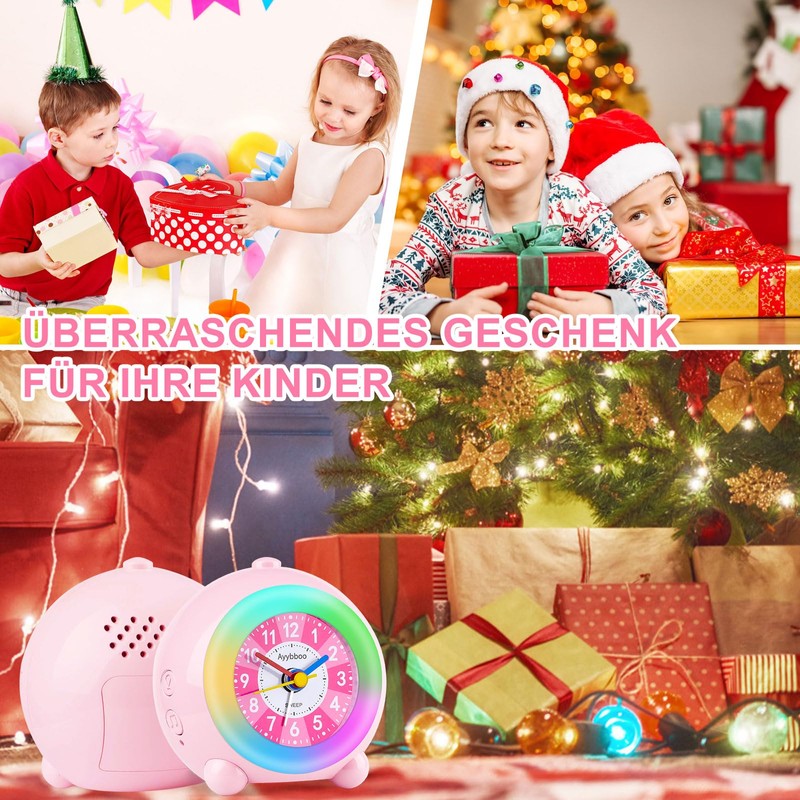 Ayybboo Children's Analogue Alarm Clock, No Ticking, Girls and Boys, Children's Alarm Clock with Colourful Night Light, Snooze, 6 Ringtones, Adjustable Volume, Learning Alarm Clock for Beginners to