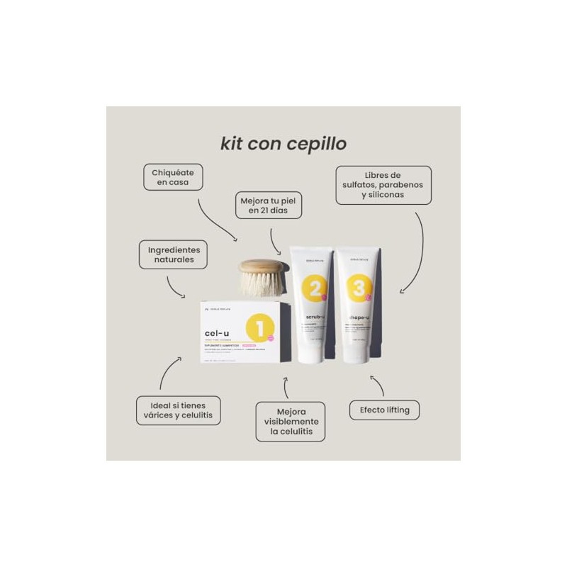 - CONTENIDO: Cel-u, Caja con 21 sobres (8 g c/u) + Scrub-u, Exfoliante de cáscara de nuez (250 g) + Shape-u, Crema hidratante de algas marinas (250 g) + Azala-brush, Cepillo de cerdas naturales