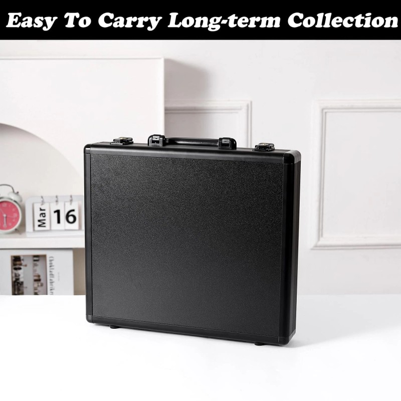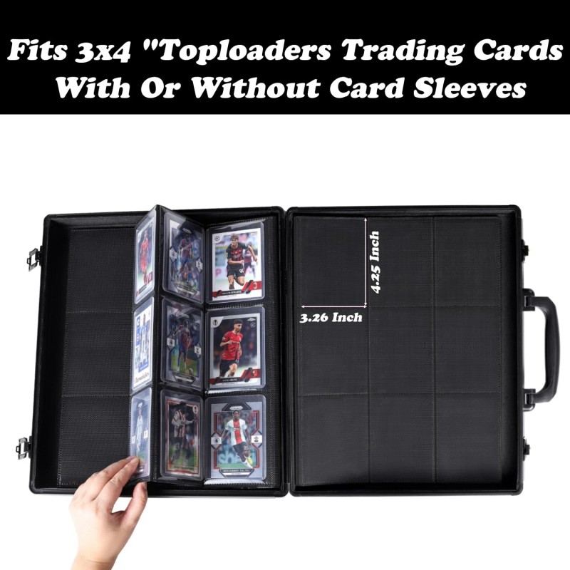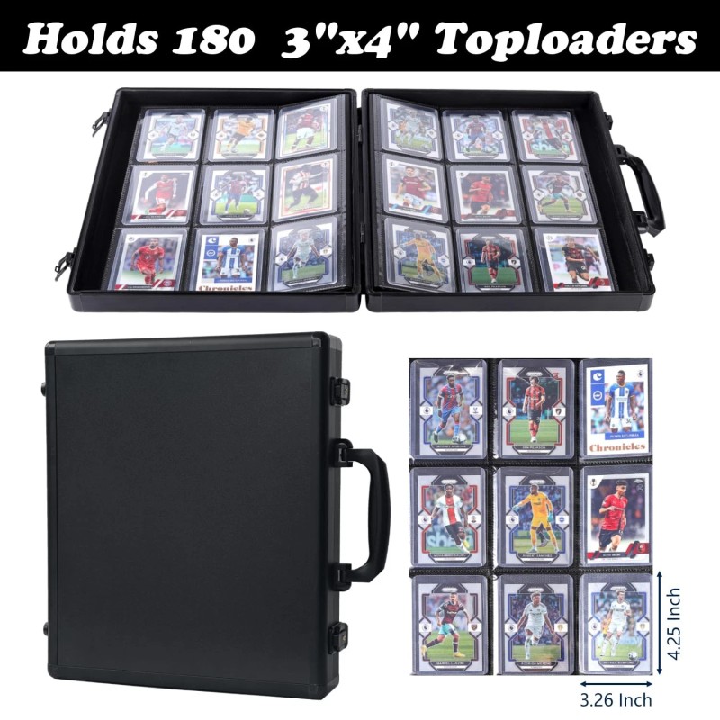 Aluminium Alloy Hard Case of Top Loader Binder: Pocket Toploader binder with sleeves and boasting 10 double-sided pages with 9 pockets per side it can holds 180 3'' x 4'' Top loaders. Pocket size 3.26'' x 4.25'', Top Loader binder size 14.17''L x 12.2''W x 2.55''H, Offer 2 different stylish colors to match your choice.