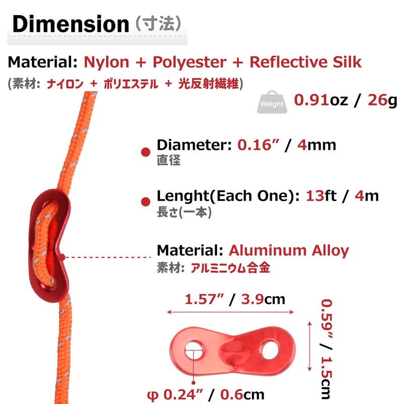 - Specification: Each canopy guy line is up to 13 ft long with a diameter of 4 mm, and weighs only 0.91 oz, making it easy to carry. It is ideal for lightweight camping, packing and hiking, and avoiding the embarrassment caused by insufficient rope length