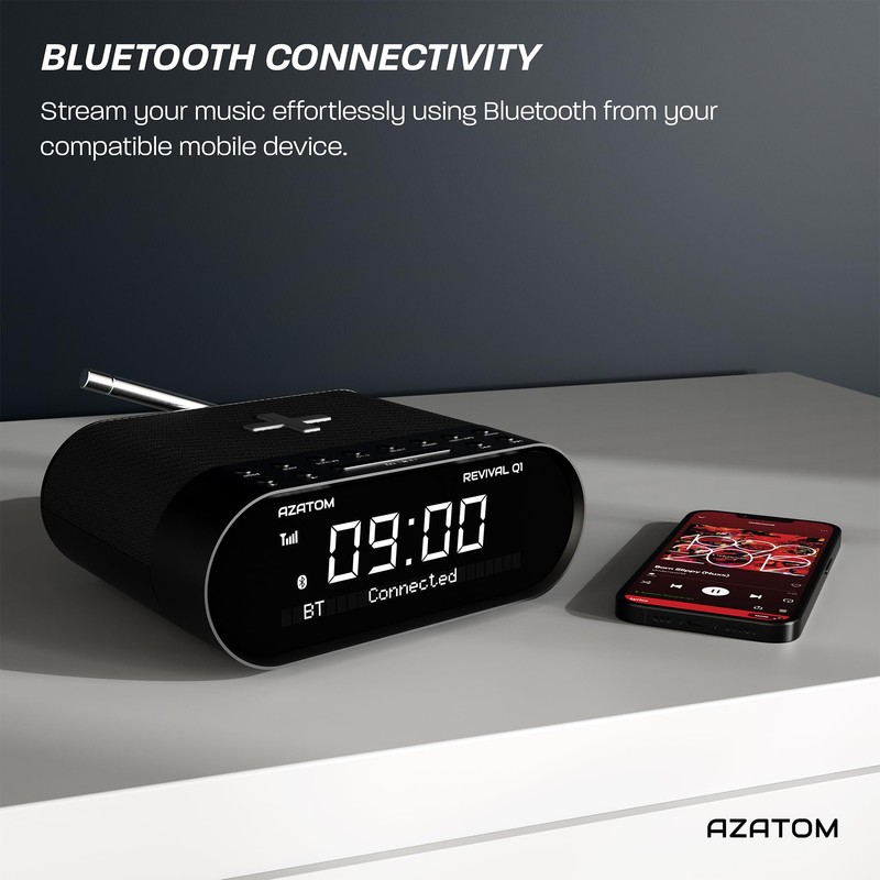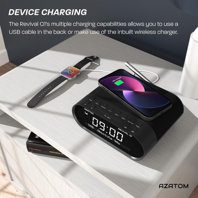 AZATOM DAB+ DAB Digital FM Clock Radio, Wireless Phone Charger, Dual Alarm, Bluetooth, Sleep Timer, USB Watch, Headphone & AUX Revival Q1