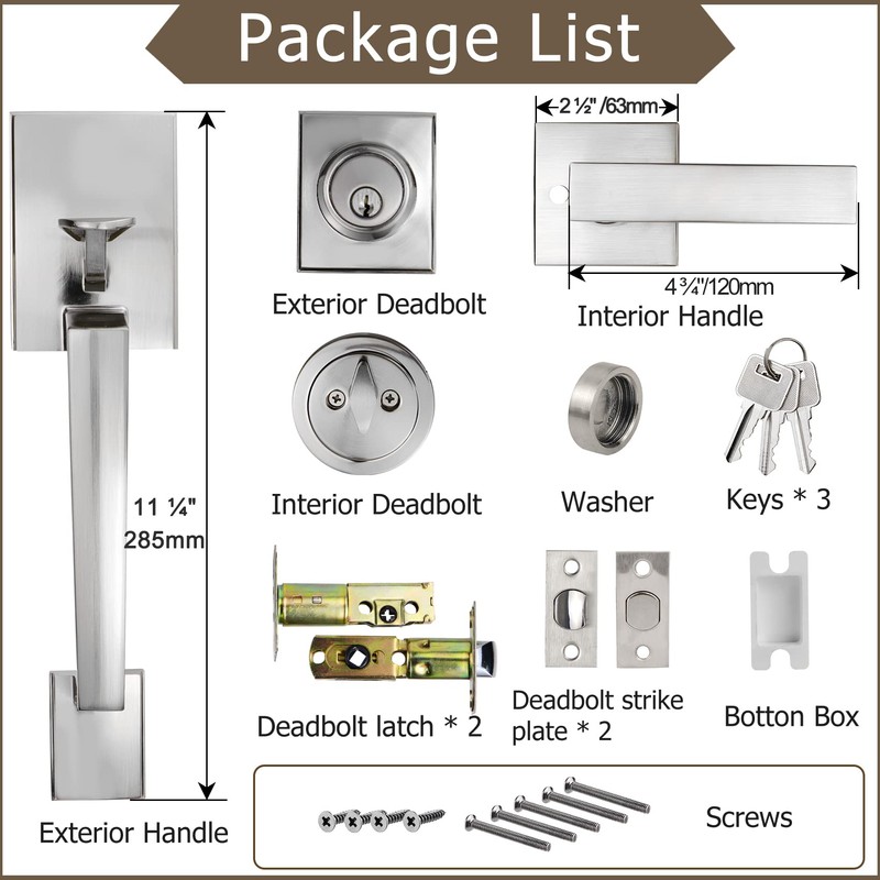 - 【Safety & Convenience】This exterior door handle comes with a single cylinder deadbolt that can be opened by an exterior key, and have a secure lock inside, which provides dependable, security for your home.The Satin Nickel front door handle and lock set includes all the necessary hardware components you need for an easy installation, including an installation instruction.