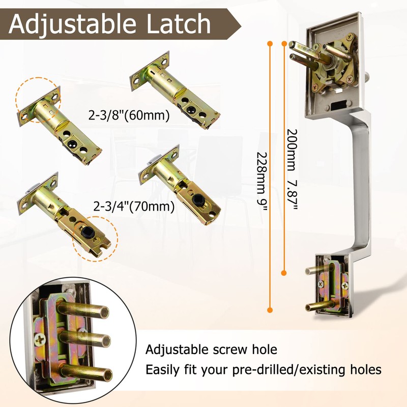 - 【Reversible Handle Lever & Adjustable latches】The 4-3/4 Inch handle lever is reversible for right and left handed side of exterior doors. The length of the door latch can be adjusted from 60mm to 70mm(2-3/8 to 2-3/4 inch).