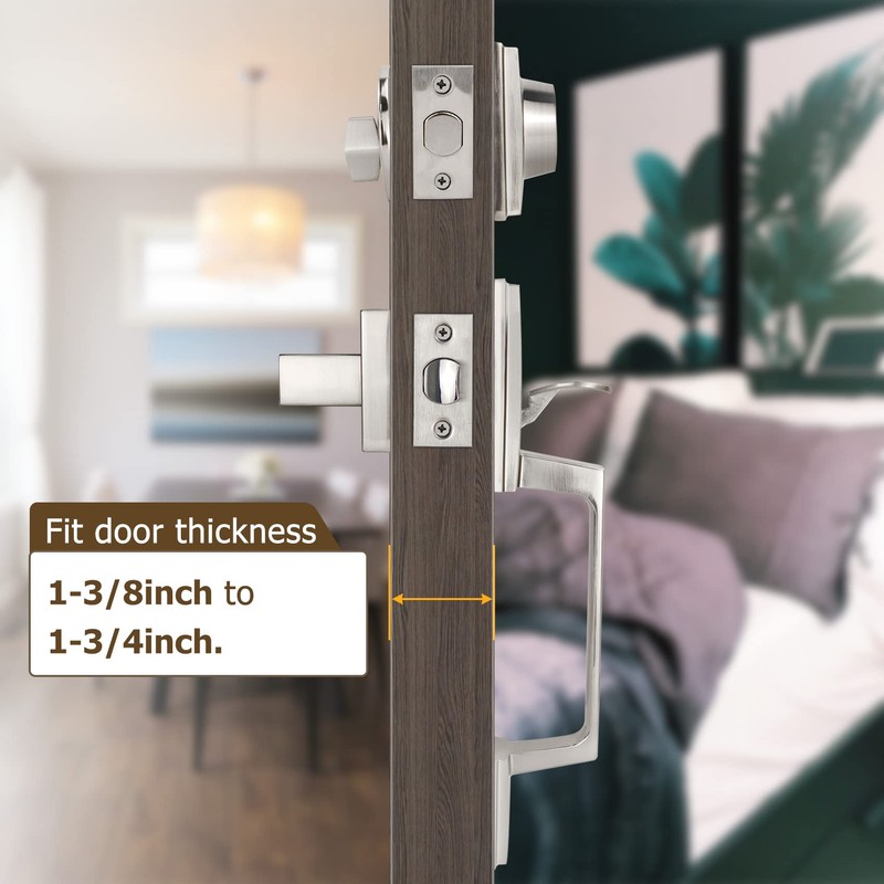 - 【Excellent Design】This front door handle is designed in both conventional and modern style, so it fits most decoration styles, and suitable for both commercial and residential applications. The Satin Nickel door handle fits most standard-sized doors ranging from 1-3/8 inch or 1-3/4 inch in thickness.