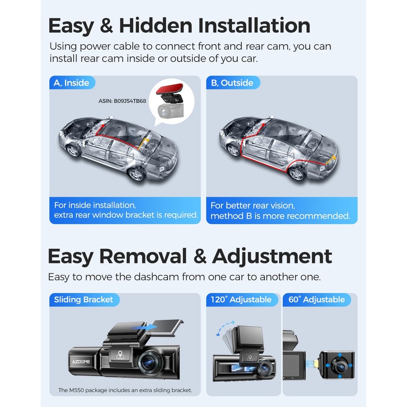- Support: The AZDOME M550 triple dashcam includes a 64GB card. For additional accessories, kindly reach out to AZDOME's support team for assistance. AZDOME provides 12 months and 24/7 customer support. For product inquiries or technical assistance, our aftersales team is always ready to assist you.