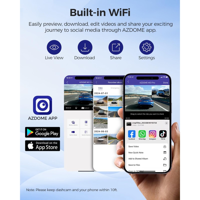 - Built in WiFi & GPS: AZDOME M01 MAX dashcam front and rear camera built-in WiFi 6. The WiFi 6 transmission speed is twice that of 2.4 GHz. Supplied with the "AZDOME" APP for Android or iOS smartphones to get a live stream, download videos, change settings, make edits and share your recordings easily. Built-in GPS allows you to track your driving route and location via the app or AZDOME GPS Player, providing important evidence in the event of an accident.