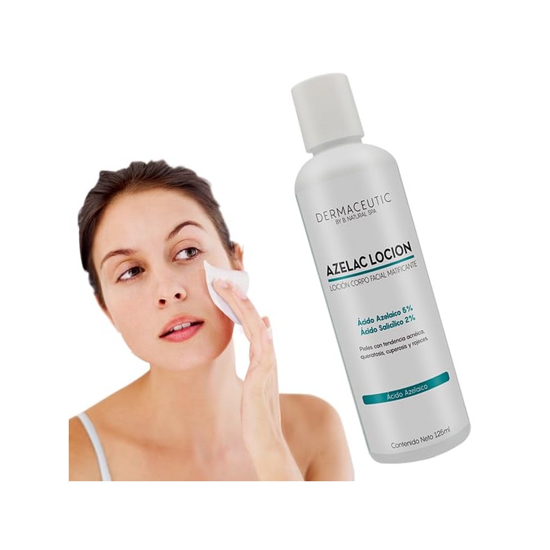 Azelac Locion Seborreguladora, Matificante y Bactericida a base de Ácido Azelaico al 5% y Ácido Salicílico al 2%.
