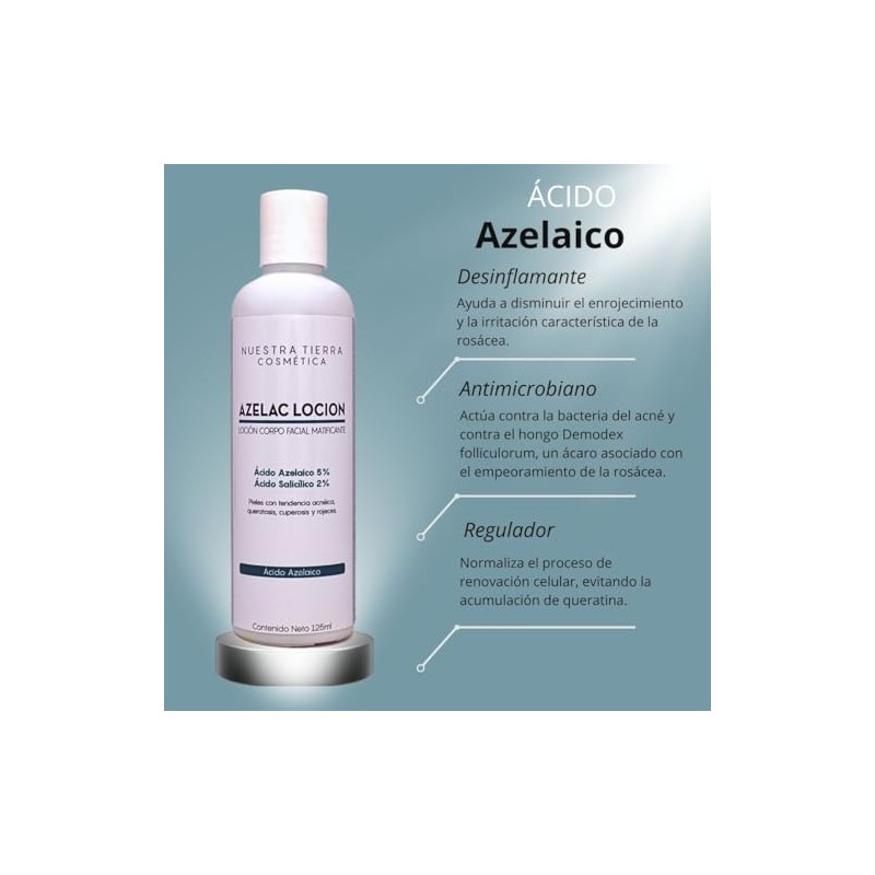 Azelac Locion Seborreguladora, Matificante y Bactericida a base de cido Azelaico al 5 y cido Saliclico al 2.