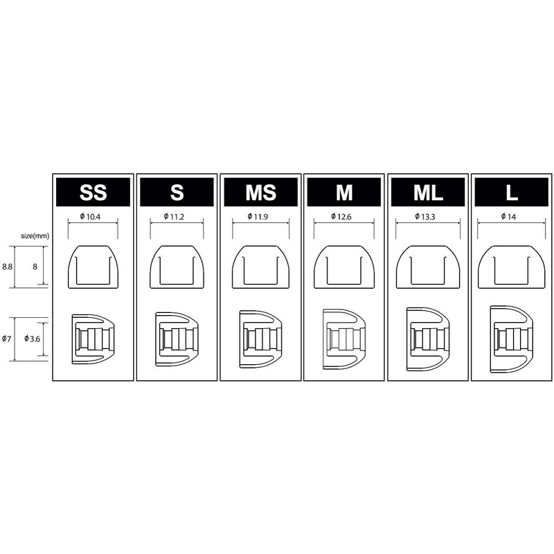 - ■ Size for improved fit for more people: SednaEarfit XELASTEC has passed down the fine size settings (6 sizes of SS/S/MS/M/ML/L) that are popular in the existing SednaEarfit series, allowing more people to experience the natural sound that has improved the fit of the earphones and a straight shape that transmits sound directly to them. In addition, we have adopted a new product configuration that includes three nearby sizes (i.e. SS/S/MS) in one pair. This makes it easier to adjust the subtle adjustments when the sizes are different from left to right. In addition, the size chart is placed on the shank for easy identification