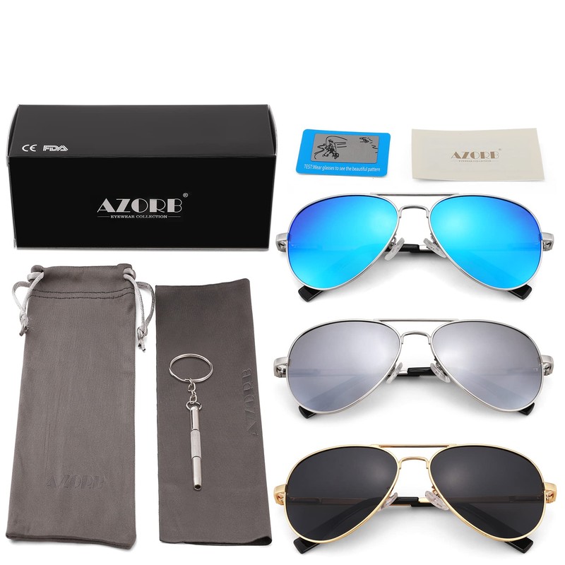 AZorb Polarized Aviator Sunglasses for Men Women Metal Frame Retro Shades UV400 Lens Protection Driving Sun Glasses - 3 Pair