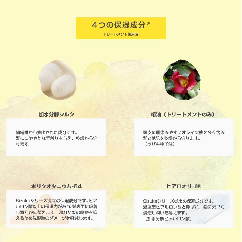 - Introducing a new formula: SIZUKA KINU formula, a new formula, from SIZUKA series that is suitable for hair problems. Repair the damage of the scalp and hair, making it delicate and supple like silk, and creates a shiny and soft texture like cashmere