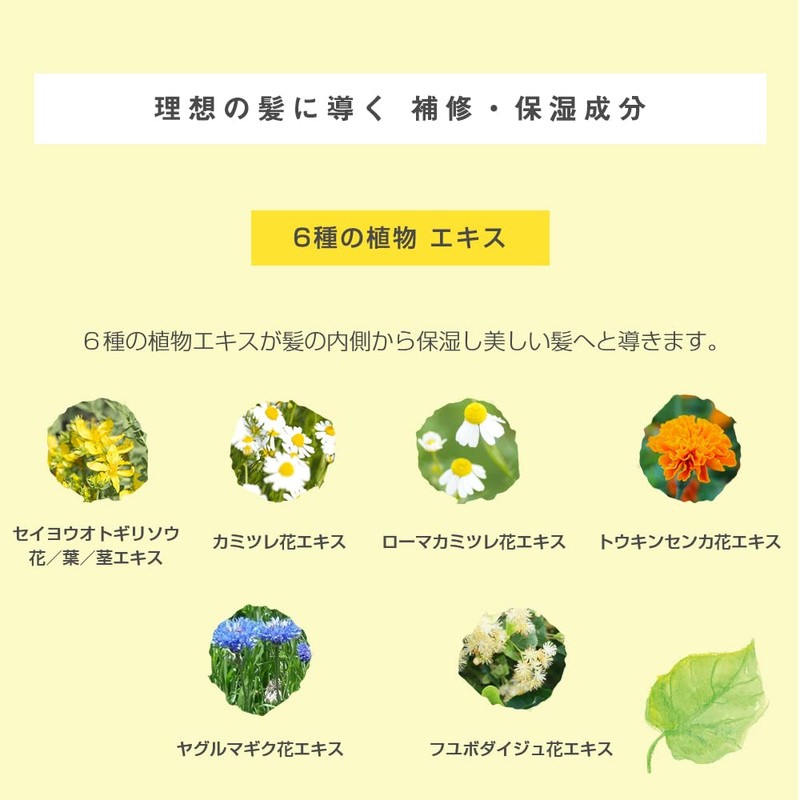 - (6 Types of Plant Extracts) 6 types of plant extracts, which moisturize from the inside of the hair to make your hair look beautiful. Walnut Flower / Leaves / Stem Extract, Chamisole Flower Extract, Roman Turtle Flower Extract, Pouxia Flower Extract, Yagurmag Flower Extract, Fuyubo Daiju Flower Extract