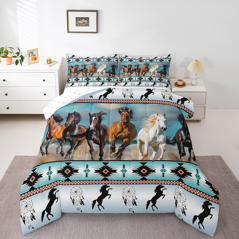 Aztec Comforter Set African Tribal Horse Printed Bedding Set,Farm Animals Duvet Insert Ethnic Tribe Arrow Dream Catcher Quilt Queen,Southwest Native Exotic Nordic Style Room Decor
