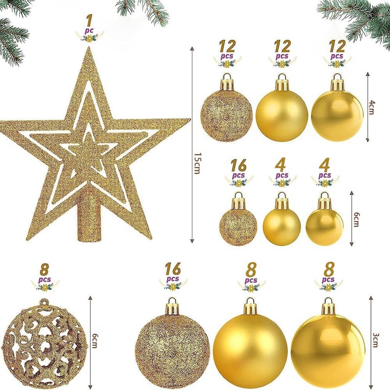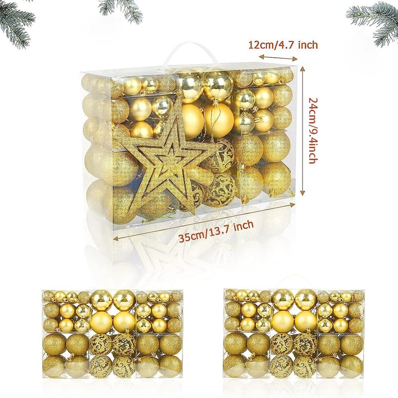 - TAMAÑO Y CANTIDADES: Bola de 3cm / 1.18"- 32pcs, Bola de 4cm / 1.57" - 36pcs, Bola de 6cm / 2.36" - 32pcs, Adorno de árbol de 15cm / 6"- 1pc, suficiente para que decore un árbol de Navidad de gran tamaño.