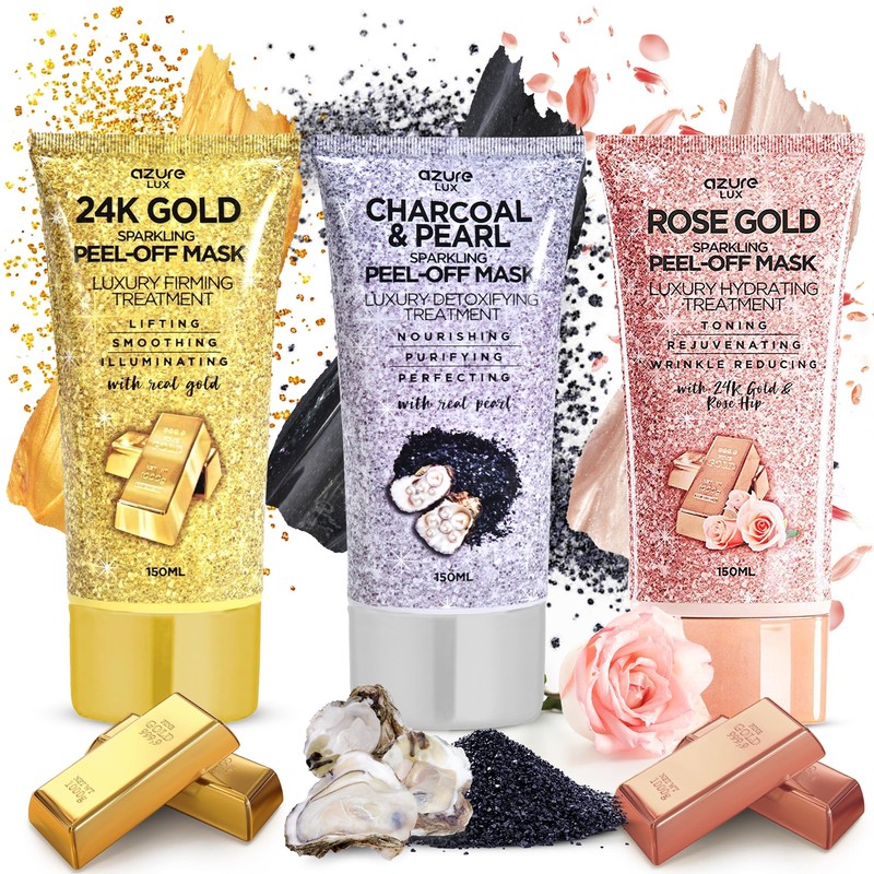 Azure Cosmetics Azure Sparkling Peel-Off Masks Bundle - Rose Gold Hydrating Peel-Off Mask - 24K Gold Firming Peel-Off Mask - Charcoal & Pearl Anti Aging Peel-Off Mask - Each (150mL / 5.07 fl.oz.)
