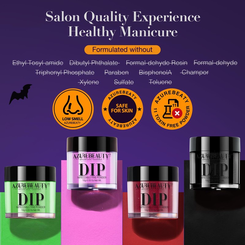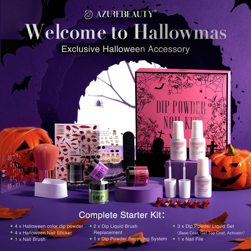 • Halloween Limited Gift Set: AZUREBEAUTY Pcs Halloween gift box complete nail dip powder kit was developed especially for beginners, including g dip powder colors with black, noctilucent purple, green, and red (Surprise tip: red add D nails accessory), Hallowmas Nail Sticker, ml liquid set (base/activator/top coat), liquid brush replacement, nail brush, nail file, dip powder recycling system, user manual quick start guide