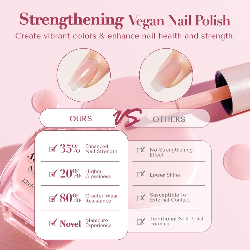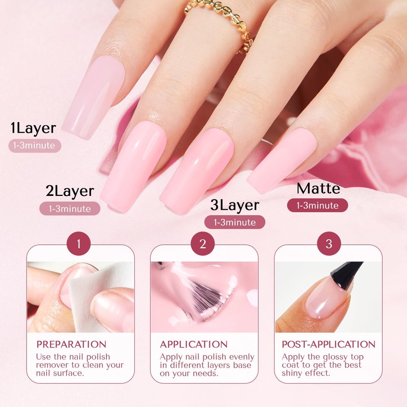 - 🌸【long-lasting & High Gloss Shine】Clear nail polish strengthener and growth fortifier double effect formula ,which is the key to long-term durability and firm nails. With proper operation and care, the manicure can last up to 7 days. The fast dry shiny top coat nail polish has been upgraded, which can improve the saturation of gloss by 20%, making the finger polished nail surface more translucent and beautiful. The effect is different for different layers, and the first layer applied is transparent jelly pink nail polish. Depending on the layering, it will produce a nice milky pink color.