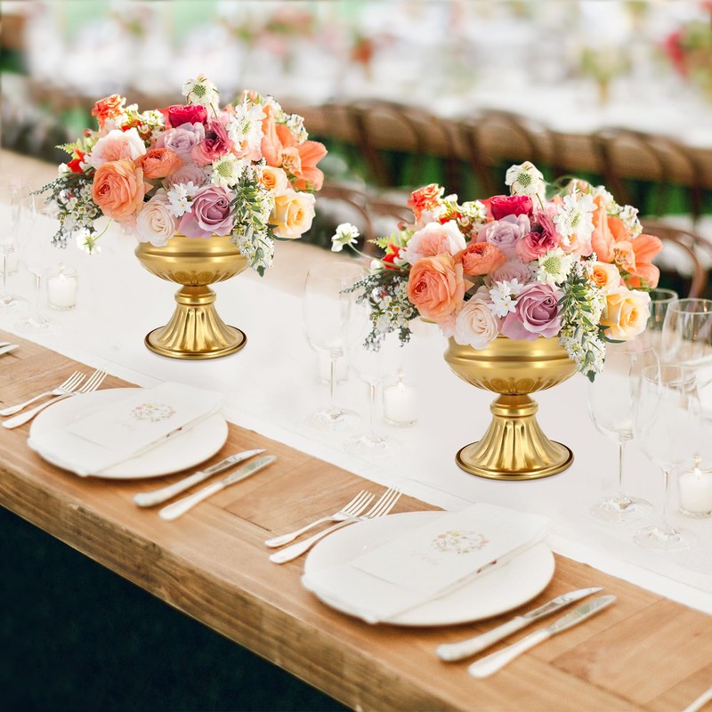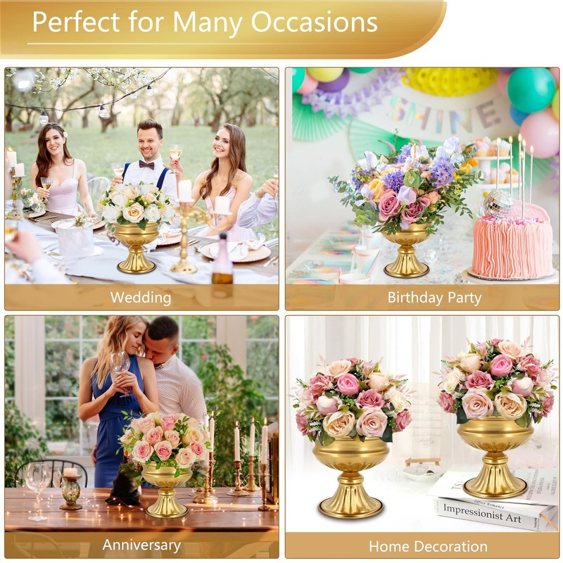 These wedding golden flower holders for centerpieces, with their stunning, sturdy, and elegant design, will complement your tabletops perfectly. Pair them with artificial flowers, seasonal blooms, floral balls, feathers, or bouquets for a truly memorable display.