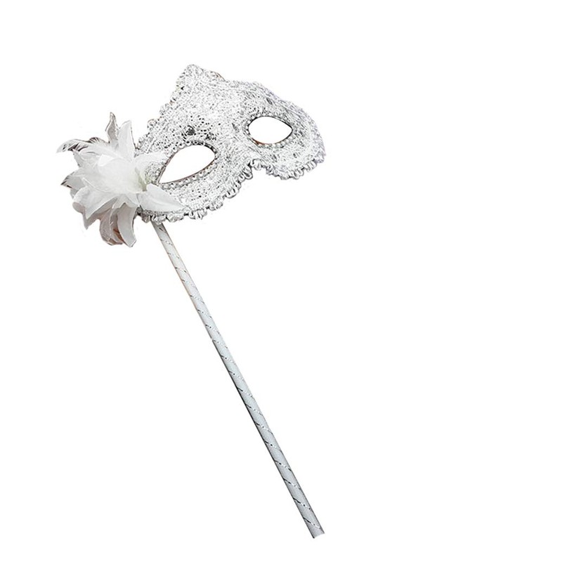 AZYOUNG Women's Masquerade Masks Side Feather Flower Petal Hand Held Lace Mask with Stick,(White)
