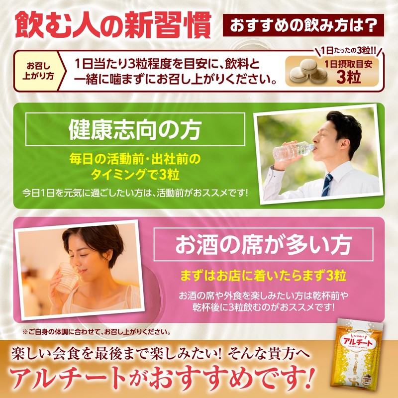 - ✅飲む人の新習慣!「アルチート」 楽しい会食を 最後まで 楽しみたい そんな貴方へ 注目成分「酢酸菌抽出物」配合!