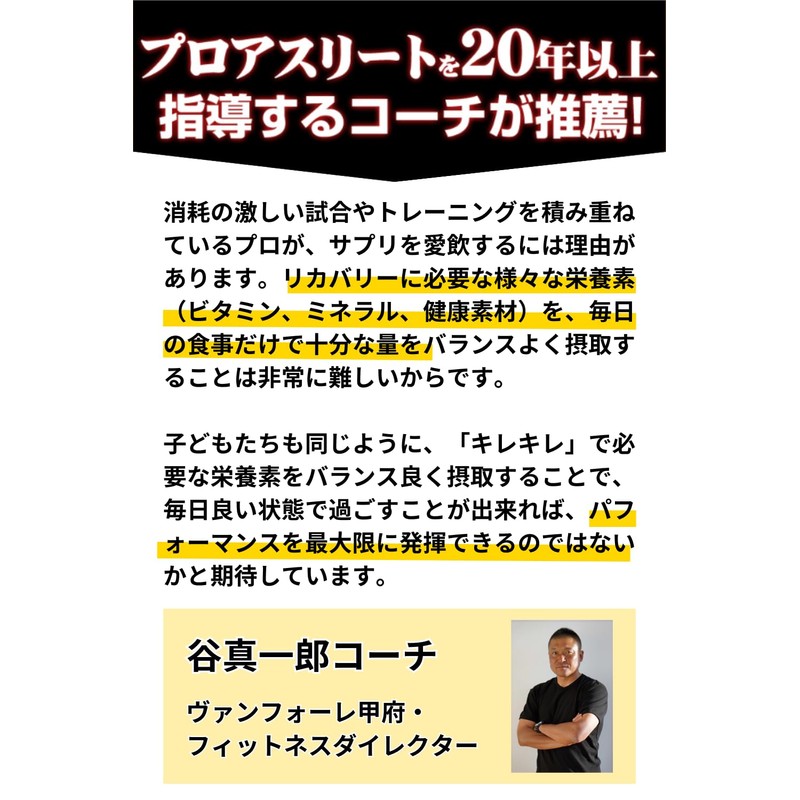 • ✅【スポーツキッズ必須アイテム】ジュニアアスリートにはたくさんの栄養素が必要!そこで私たちが開発したのが、成長期のスポーツ専用マルチビタミンサプリメント「キレキレ」です。小粒の中に子供に必要なビタミンb群やイミダゾールジペプチド(イミダペプチド)、カルシウムなど大切な栄養がたっぷり凝縮。キレキレは、頑張る子ども達を強力サポートします!