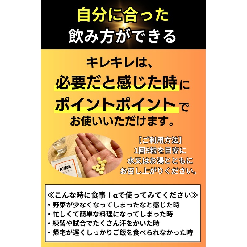 • ✅【小粒で飲む量調節に便利】キレキレは小粒のマルチビタミン錠剤で、日ごとに調整可能です。毎日飲まなくても、練習や試合が続いた日や、食事のバランスが偏ったなという日に飲んだりと、お子様の体調や生活に合った飲み方ができます。イミダゾールジペプチド(イミダペプチド)とビタミンb群など30種類の栄養素が凝縮されたキレキレをおすすめします。