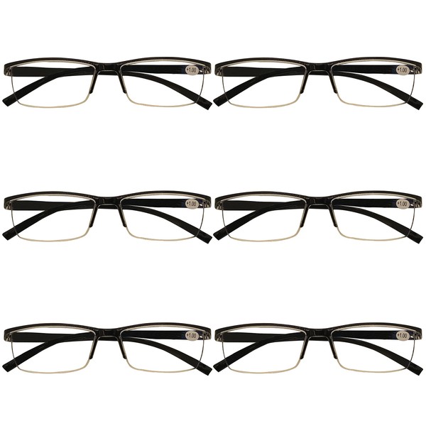 B and Q 6 Pack Mens Rectangular Half Frame Blue Light Blocking Reading Glasses Black Spring Hinge Readers (BQ8008 BK x 6, 3.50)