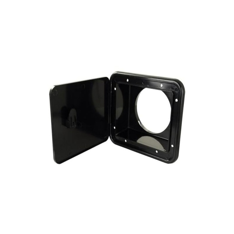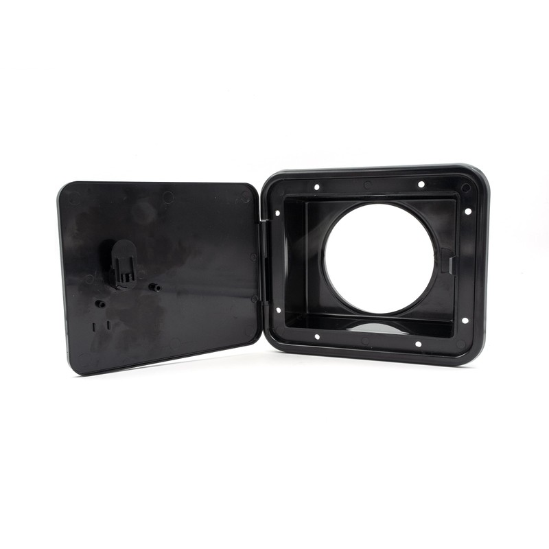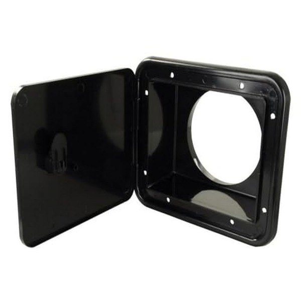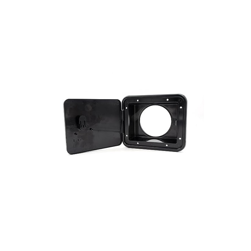 - Back plate accepts a 4" rigid PVC or flexible hose to create a storage area