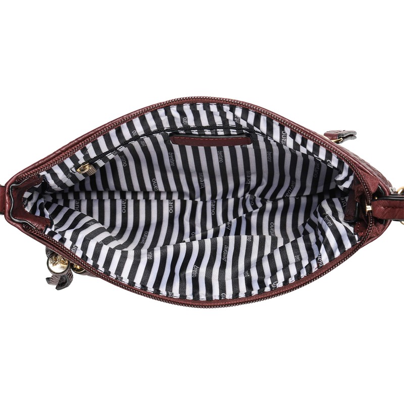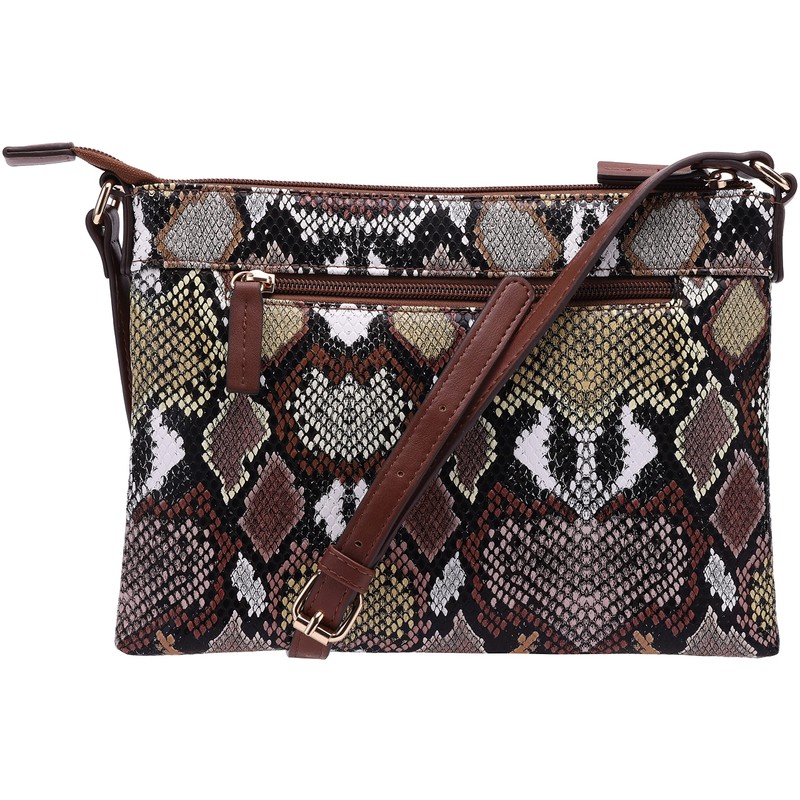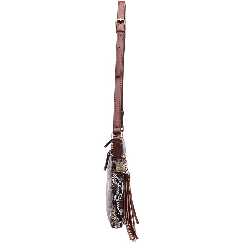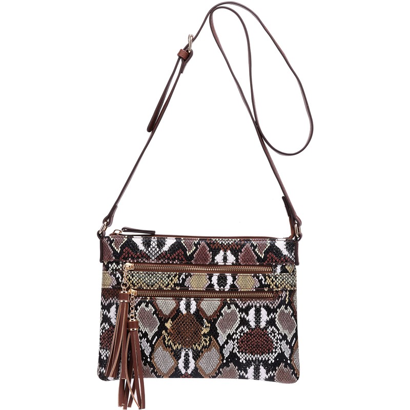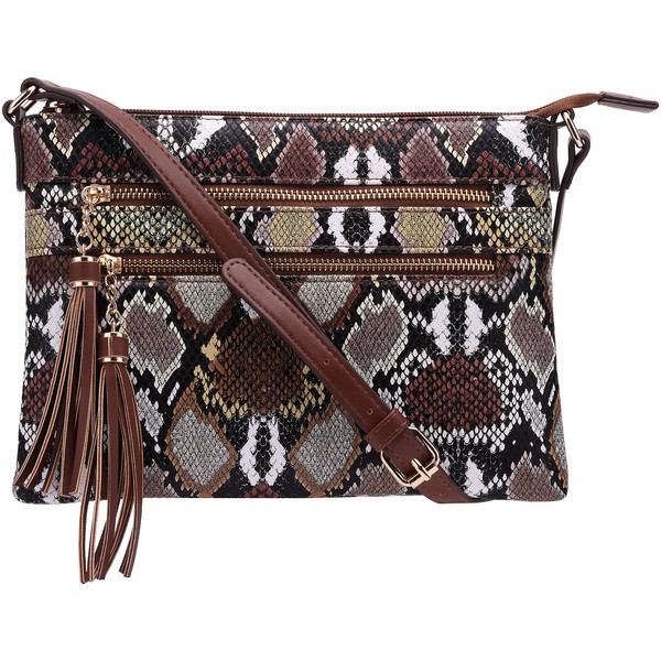 B BRENTANO Vegan Multi-Zipper Crossbody Handbag Purse with Tassel Accents (Multi-Python Brown)