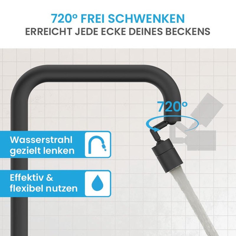 • Einfache Montage - Mit nur ein paar Handgriffen l?sst sich Ihr Wasserhahn innerhalb weniger Minuten mit dem schwenkbaren Wasserhahn Aufsatz ausrsten - alter Perlator raus, neuer Aufsatz dran - fertig!