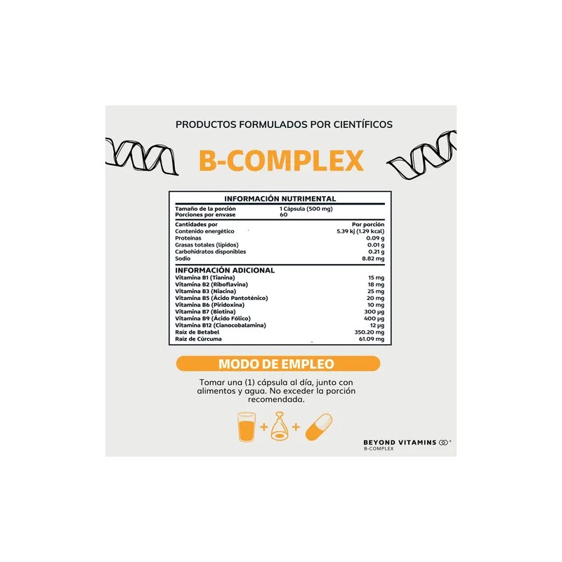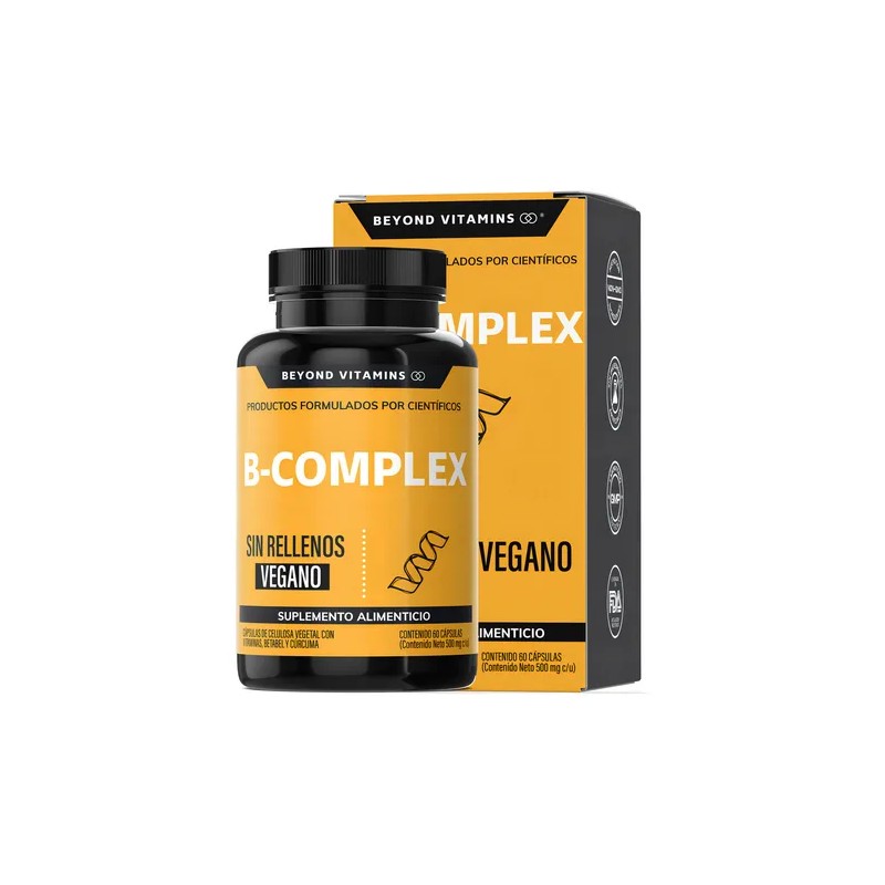 B Complex Beyond Vitamins contiene una combinación completa de Vitamina B1, B2, B3,B5, B6, B7, B9, B12, Raíz de Betabel y Raíz de Curcuma. Nuestro producto son el resultado de investigación y estrictos estándares de control de calidad. Es ideal para hombres, mujeres y personas mayores. Nuestro B Complex es libre de lácteos, soya, hormonas, antibióticos, conservantes, azúcar, colorantes y sabores artificiales. Es VEGANO.