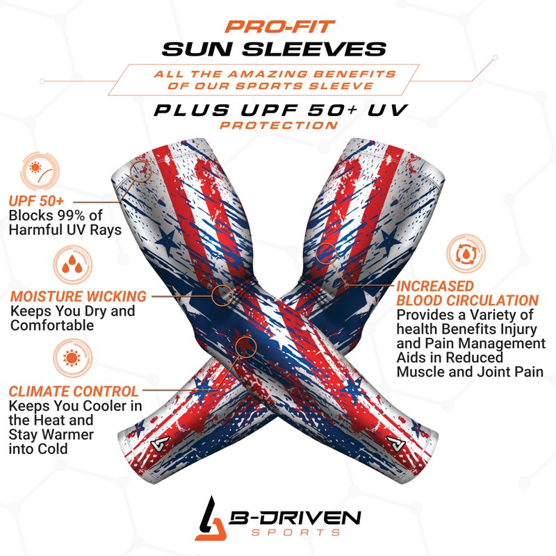 - COMPRESSION PERFORMANCE + UPF 50 PROTECTION:The B-Driven Sports Sun Sleeve not only protects you against 99.9% of the sun's harmful UV Rays, but it also provides athletic compression, helping with arm ailments including swelling, soreness, and elbow pain. This combination sleeve makes it a perfect UV compression sleeve for golf, cycling, running, and many other activities, including casual wear.