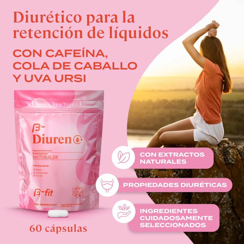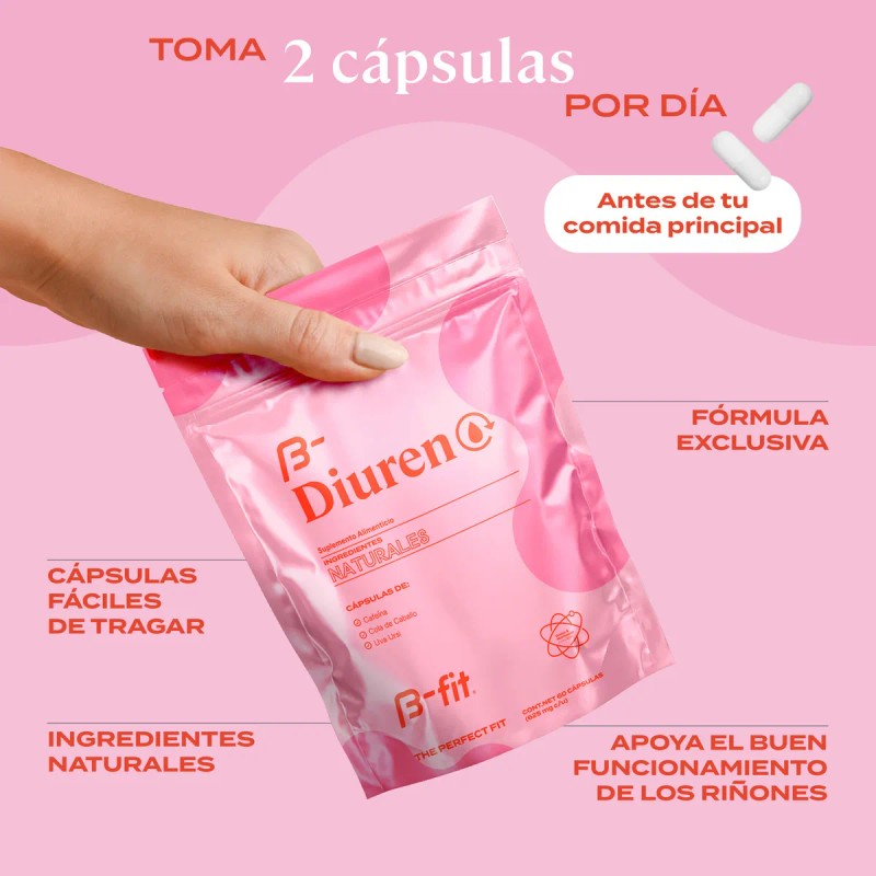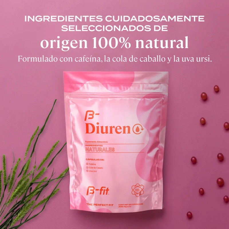 Descubre el poder del diurético natural con B-Fit Diuren. Nuestro suplemento alimenticio está compuesto por ingredientes de origen 100% natural, seleccionados cuidadosamente por sus propiedades diuréticas para ayudarte a combatir la retención de líquidos y apoyar la función renal sin comprometer tu bienestar general.