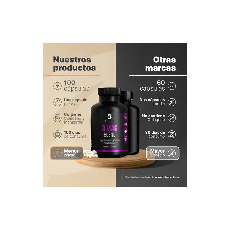 B Life 3 Mag Blend – Mezcla de Citrato, Óxido y Gluconato de Magnesio con Manzanilla y Colágeno (100 Cápsulas)