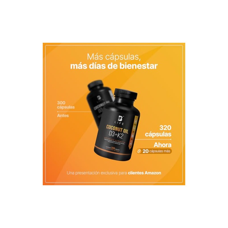 🌟 ⭐ B Life Vitamina D3 400 UI + K2 con 320 Softgels. Alta absorsión. Aceite de Coco, Vitaminas D3 y K2. Ingredientes naturales. Coconut Oil D3 + K2. ⭐ 🌟