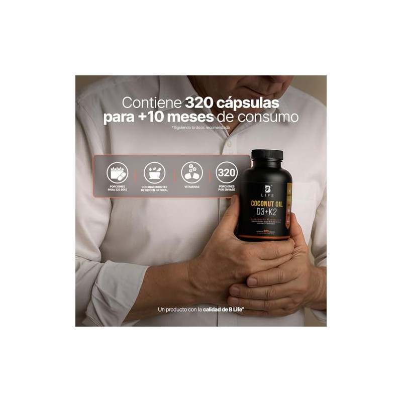 B Life Vitamina D3 400 UI K2 con 320 Softgels. Alta absorsin. Aceite de Coco, Vitaminas D3 y K2. Ingredientes naturales. Coconut Oil D3 K2.
