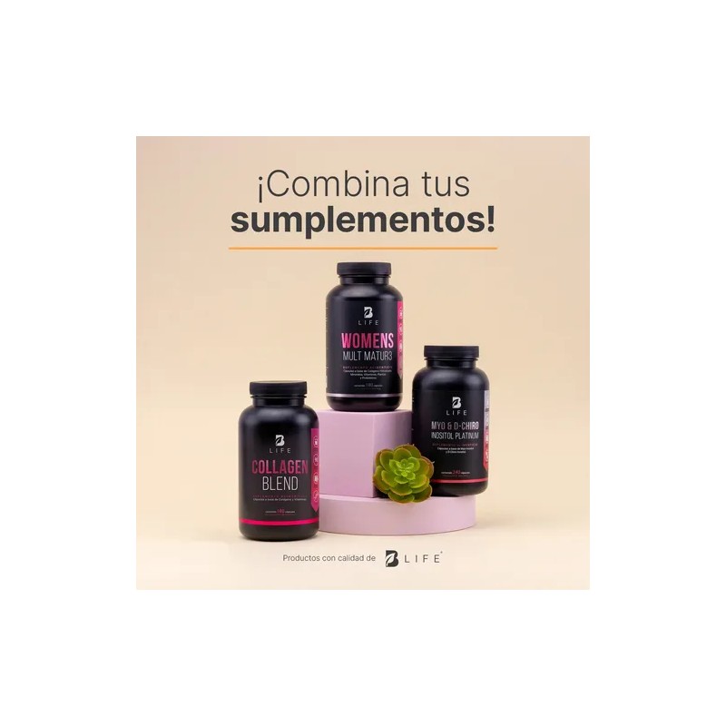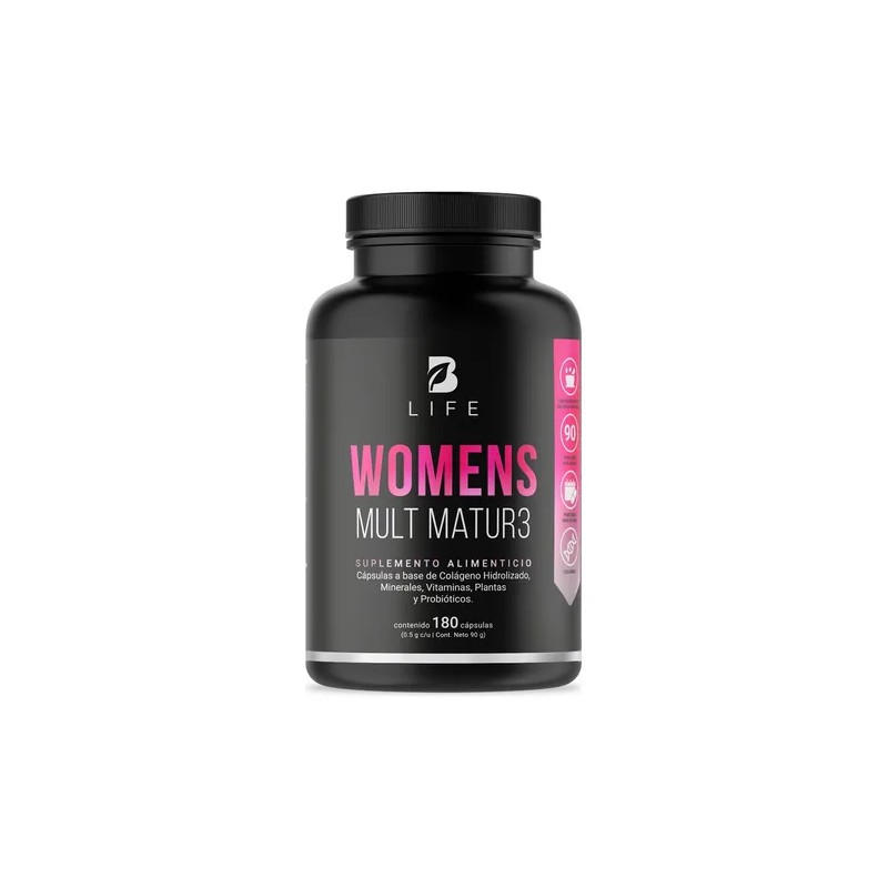 Womens Multi Plus de B Life es un multivitamínico diseñado especialmente para mujeres mayores de 40 años. Su fórmula avanzada combina colágeno hidrolizado, maca, inositol, calcio, probióticos y un complejo completo de vitaminas que apoyan la salud hormonal, ósea, digestiva y energética. Ideal para acompañar esta etapa con vitalidad y equilibrio.