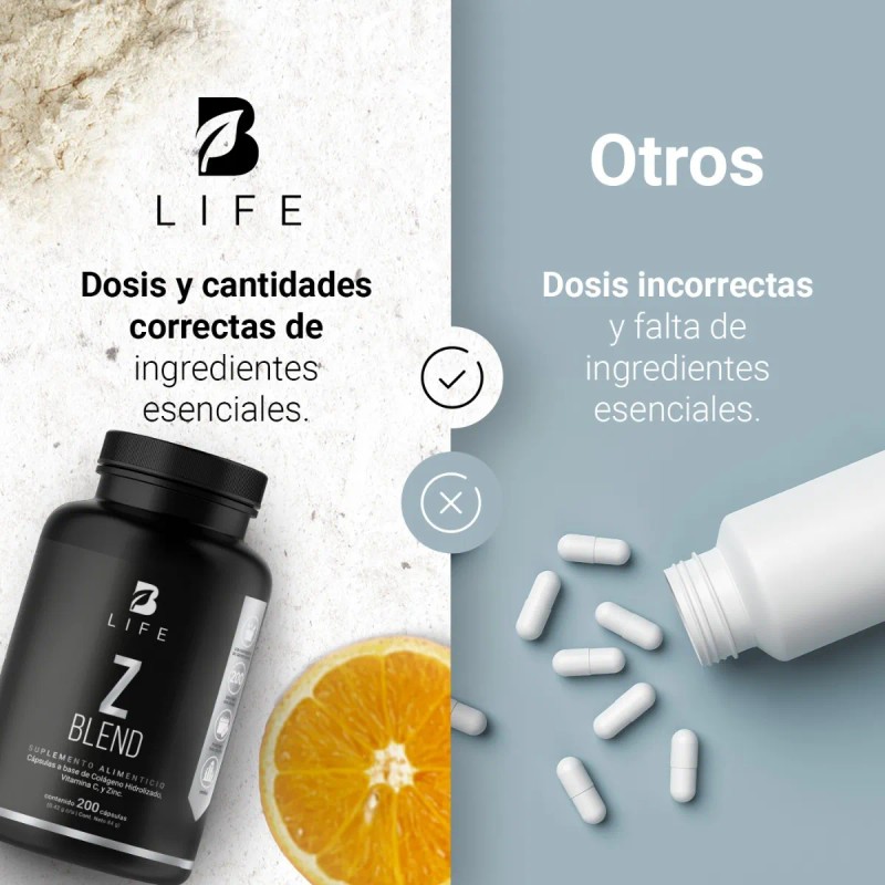 ¡Z Blend B Life, protección y bienestar en cada porción! Cada cápsula de 420 mg ofrece una composición especial que combina Zinc, Vitamina C y Colágeno, una formulación única que integra minerales, vitaminas y proteínas esenciales para tu vitalidad. Esta poderosa combinación no la encontrarás en otras presentaciones. Contiene 200 cápsulas.
