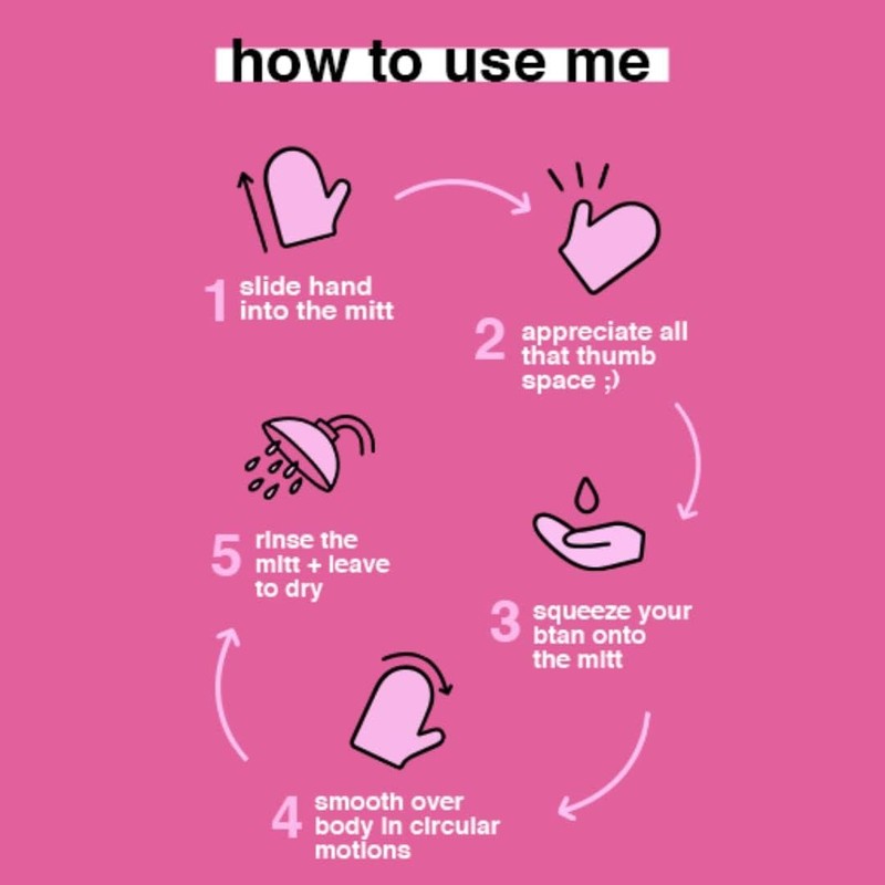 - BEST PRACTICE. slide your hand into mitt.put a small amount of b.tan self tan mousse or lotion onto the mitt. smooth all over your body in circular motions. ta-da! an awesome dark tan with no streaks. designed for lefties or righties - any hand will do!