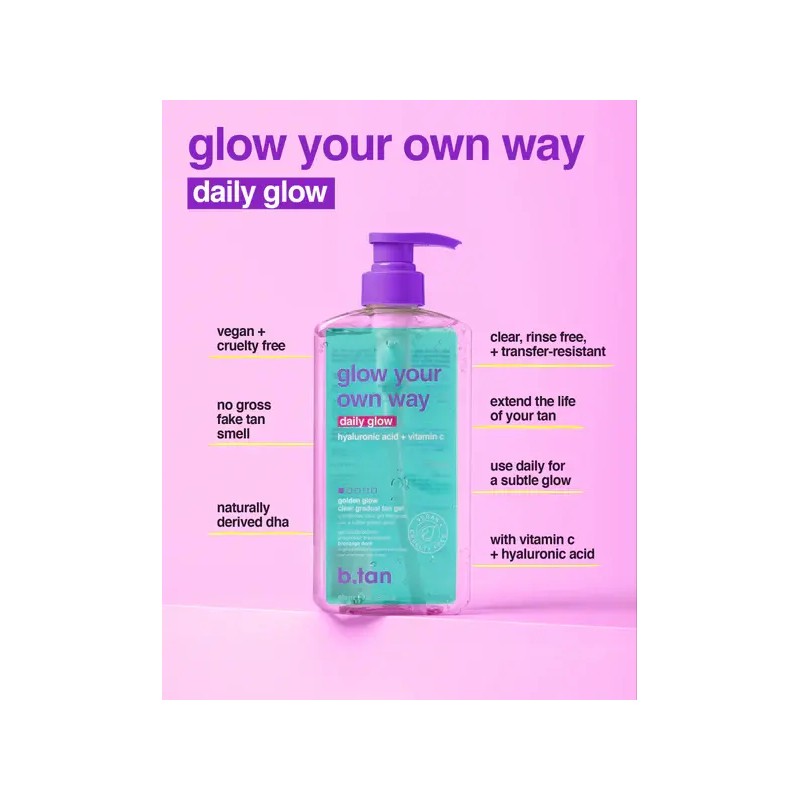 The B.tan Glow Your Own Way Daily Glow Gradual Self Tan Gel is your go-to for an effortless, gradual tan with extra skincare benefits. This clear, lightweight gel provides intense hydration while slowly building a beautiful, natural glow. Enriched with hyaluronic acid and vitamin C, this formula helps brighten, protect, and deeply nourish your skin. Use it daily to intensify your glow or between tanning sessions to extend your tan.