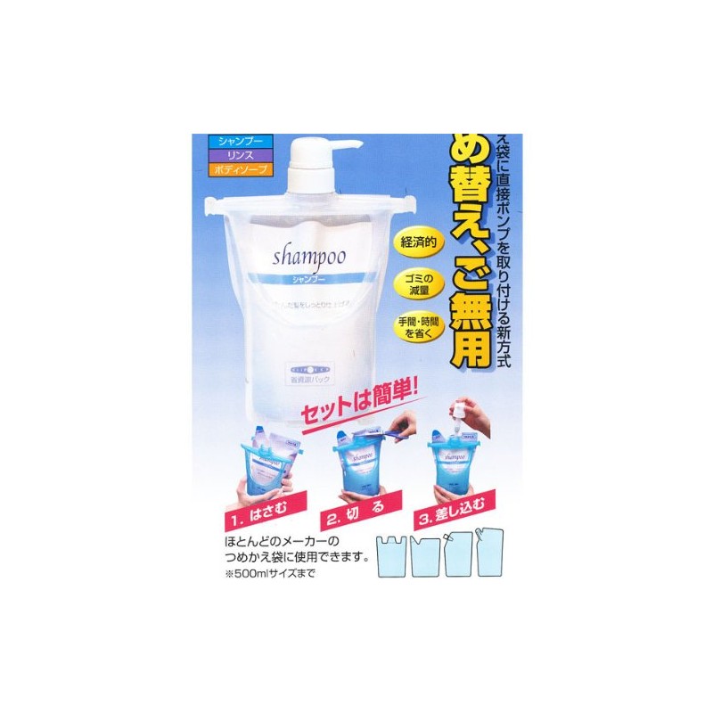 Use the refill pack as is. ◆ Shampoos and conditioners are often used with "refill packs". ◆This refill bottle is a new way to attach the pump directly to the refill pack. Reduces the hassle of refilling and saves time. No more spills. Note: Can be used with refillable bags from most manufacturers. Up to approximately 16.9 fl oz (500 ml). Set Method: (1) Remove the pump and the left and right lock and insert the refill bag (2) Cut the mouth of the refill bag with scissors and insert the pump. Product Size (W x D x H): Approx. 6.1 x 2.8 x 8.3 inches (15.5 x 7 x 21 cm); Product Weight: Approx. 3.7 oz (115 g); Material: Main body: Polypropylene; Pump: Polypropylene, polyethylene, stainless steel; Color: Green, Purple