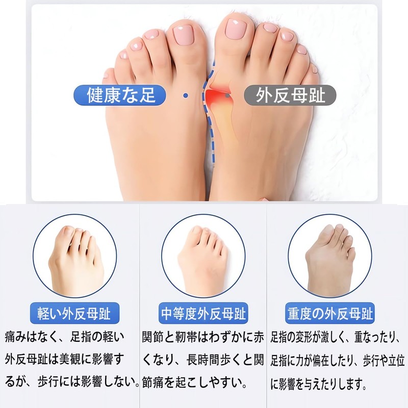 - 【注意事項】外反母趾は長年の習慣によって、骨や靭帯、腱などのバランスが 崩れたまま固着してしまった状態と言えます。 これを元に戻そうと最初から無理に長時間の装着をしてしまうと、 逆に痛みが酷くなる可能性があります。 ご使用の際は必ず徐々間を延ばすようにしてください。